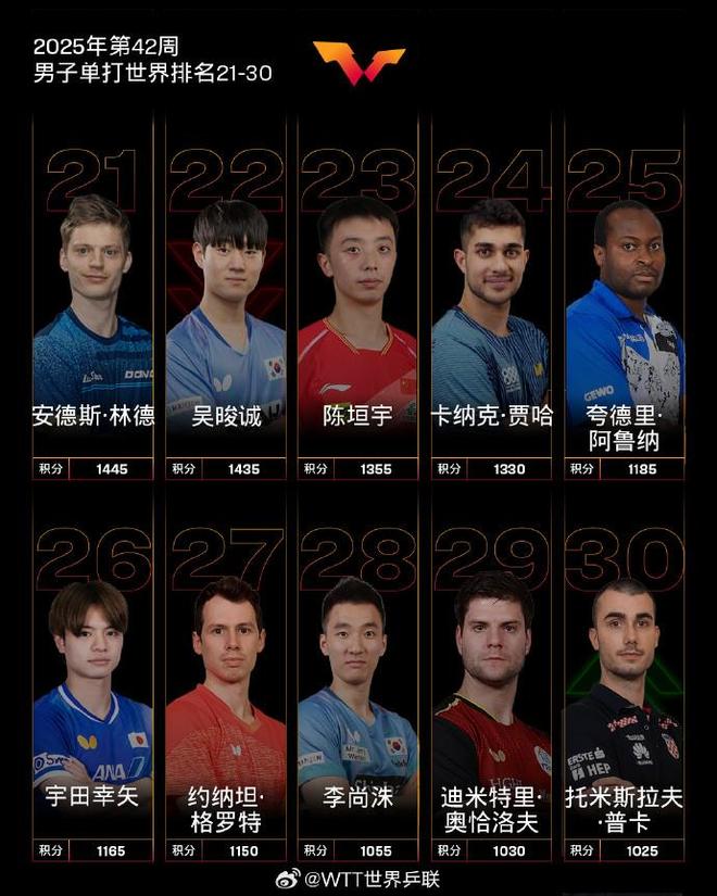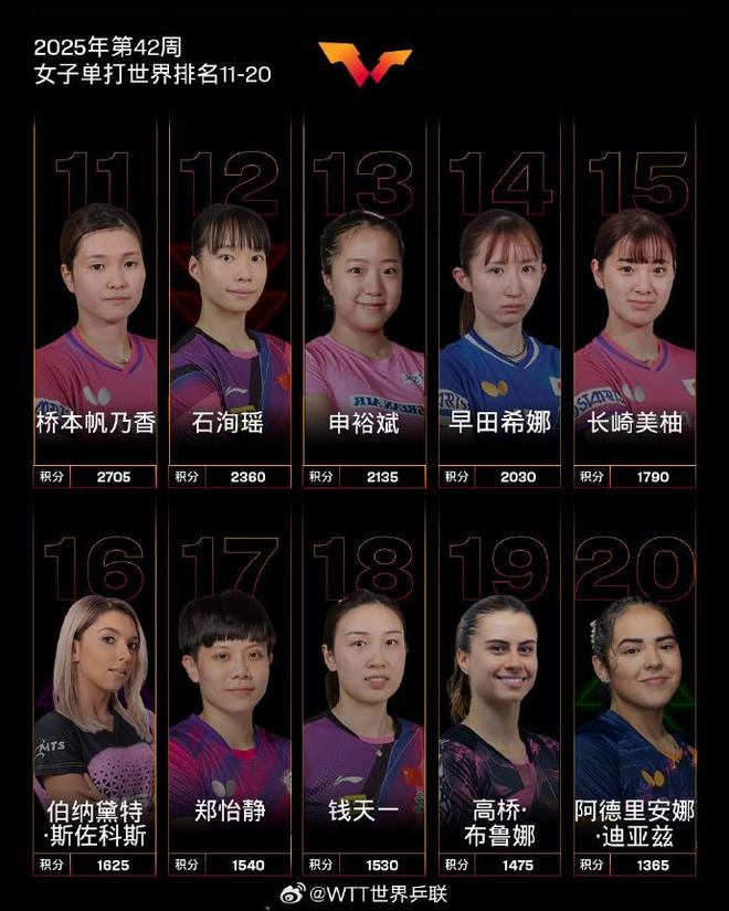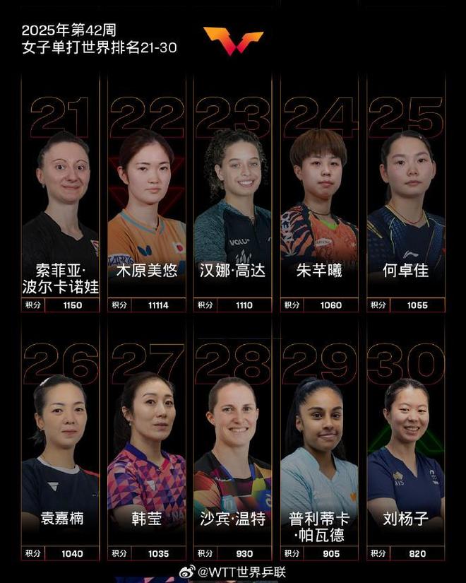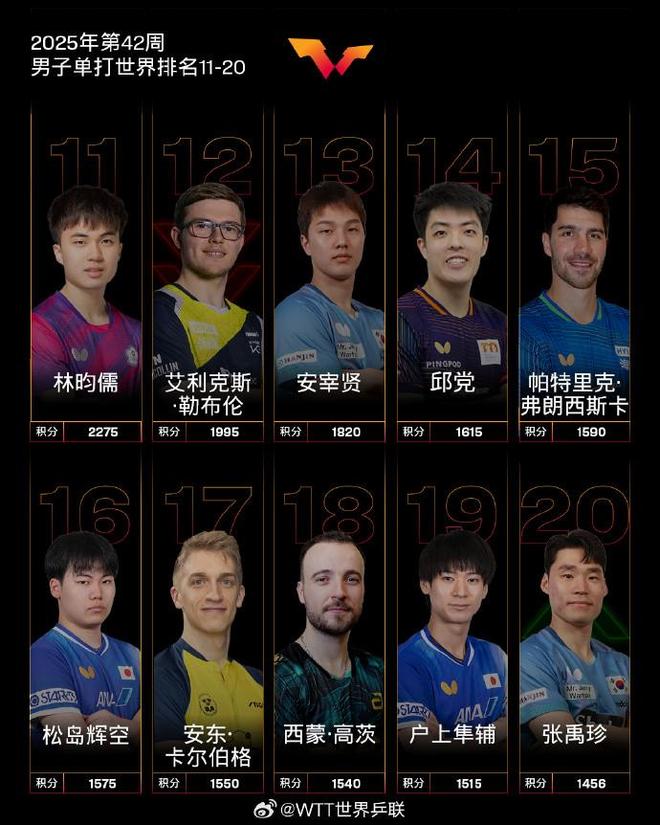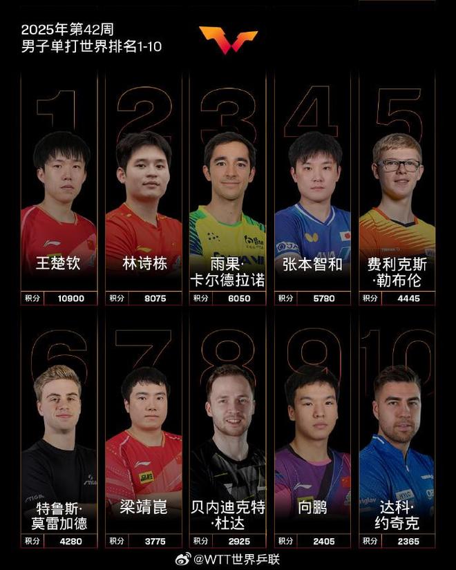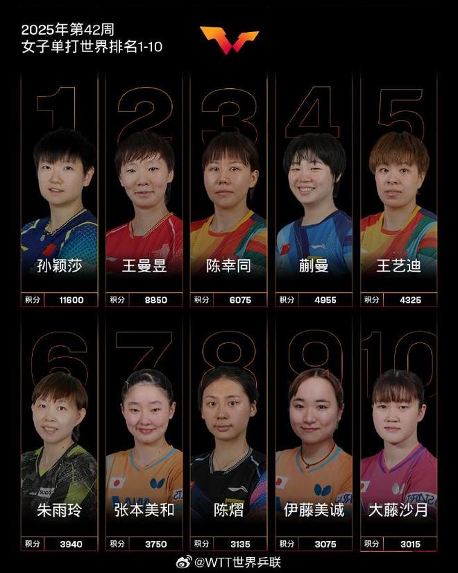 国际乒联2025年第42周世界排名:王楚钦孙颖莎各自领跑男女单打