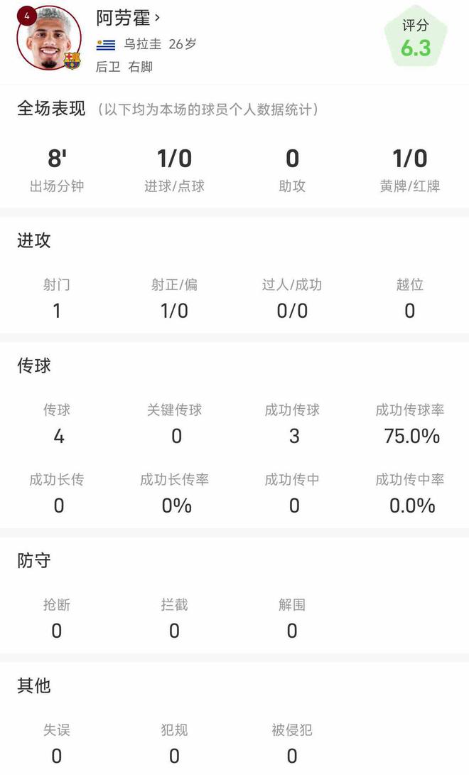 雷速体育10月19日讯 本轮西甲,巴萨2-1击败了赫罗纳。 值得一提的是,本场比赛阿劳霍坐替补席上,第82分钟才替补登场,而且上场后踢的是9号的位置,并且取得了重要的进球。 统计显示,阿劳霍本场比赛上场8分钟,1次射门,打入1球。 他有4次传球,其中3次成功传球准确率为75%。 因为上场时间短,阿劳霍的统计数据并不多。 |
