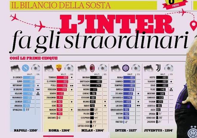 但比赛消耗和旅途奔波却是不可避免的。在意媒统计的意甲目前排名前五球队的国际比赛日消耗中,国米国脚们1527分钟总出场时间是最长的,第二名AC米兰只有1364分钟,其他三队只有1200多分钟,国米明显高出一截。