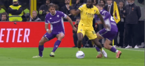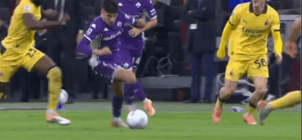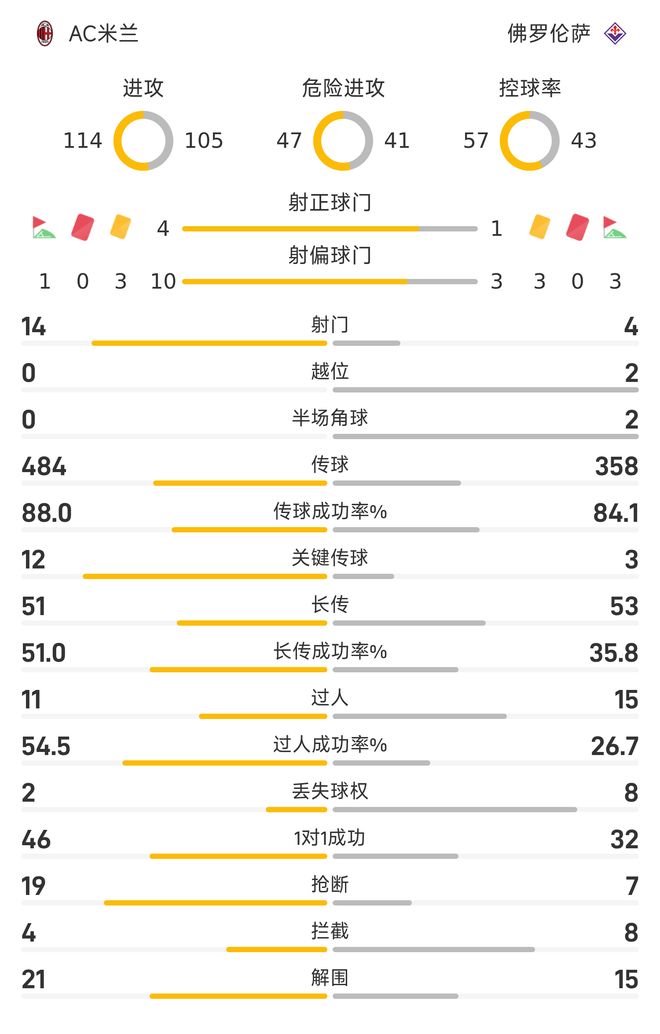 雷速体育10月20日讯 25/26赛季意甲联赛第7轮,AC米兰2-1战胜佛罗伦萨。上半场比赛两队互交白卷,下半场比赛戈森斯混战破门帮助佛罗伦萨首开纪录。随后莱奥远射破门扳平比分,比赛最后时刻莱奥点射破门梅开二度,帮助米兰成功完成逆转。 关键事件 55’戈森斯混战破门,AC米兰0-1佛罗伦萨 63’莱奥轰出弧线球世界波,AC米兰1-1佛罗伦萨 86’吉梅内斯禁区被拉倒,莱奥主罚点球命中,米兰2-1佛罗伦萨 常规事件 21’帕夫洛维奇门前绝佳机会,皮球打高出界 32’半小时仅两脚射门,米兰依旧后场耐心传递倒脚 40’莱奥反击传球,最终遭解围 45’萨勒马科尔斯远射,皮球直飞二楼 50’黄牌-阿特卡梅(AC米兰) 手球犯规 53’卡维利亚远射打偏,佛罗伦萨完成本场首脚射门 54’黄牌-卡维利亚(佛罗伦萨) 犯规 60’黄牌-弗法纳(AC米兰) 对判罚表达异议 70’吉梅内斯头球攻门,皮球顶偏出界 74’黄牌-托莫里(AC米兰) 犯规 75’多多起脚远射,皮球稍稍打高出界 76’神扑!吉梅内斯禁区打门,德赫亚将球托出底线 技术统计 球员名单 AC米兰首发阵容:16-迈尼昂、23-托莫里、46-加比亚、31-帕夫洛维奇、14-莫德里奇、19-弗法纳、4-里奇、33-巴特萨吉、24-阿特卡梅(57’7-吉梅内斯)、10-莱奥(90’25-巴伦蒂恩)、56-萨勒马科尔斯(90’5-德温特) AC米兰替补阵容:1-泰拉恰诺、37-皮塔雷拉、5-德温特、27-奥杜古、42-萨拉、7-吉梅内斯、25-巴伦蒂恩 佛罗伦萨首发阵容:43-德赫亚、18-马里、5-庞格拉契奇、6-拉涅利、21-戈森斯(69’65-帕里西)、8-曼德拉戈拉(88’9-哲科)、2-多多、14-卡维利亚(87’7-索姆)、44-法乔利、22-法齐尼(70’10-古德蒙德森)、20-基恩(77’91-皮科利) 佛罗伦萨替补阵容:1-莱泽里尼、30-马蒂内利、65-帕里西、26-维蒂、15-科穆佐、29-福蒂尼、60-库阿迪奥、11-萨比里、7-索姆、27-恩杜尔、9-哲科、10-古德蒙德森、91-皮科利 |