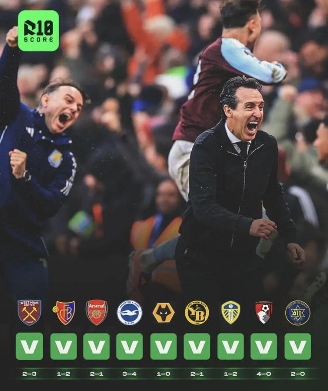 埃梅里的球队上一次没赢球是英超第10轮客场0-2不敌利物浦,那也是维拉最近11场英超的唯一失利(10胜1负)。