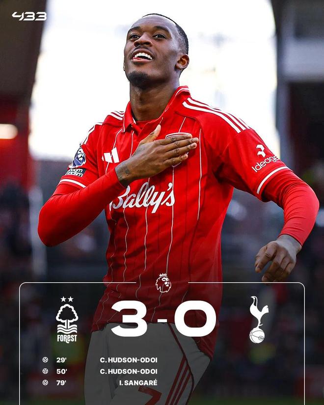 英超第16轮,诺丁汉森林坐镇主场迎战热刺。凭借奥多伊的梅开二度以及桑加雷的进球,森林在主场3球完胜热刺。